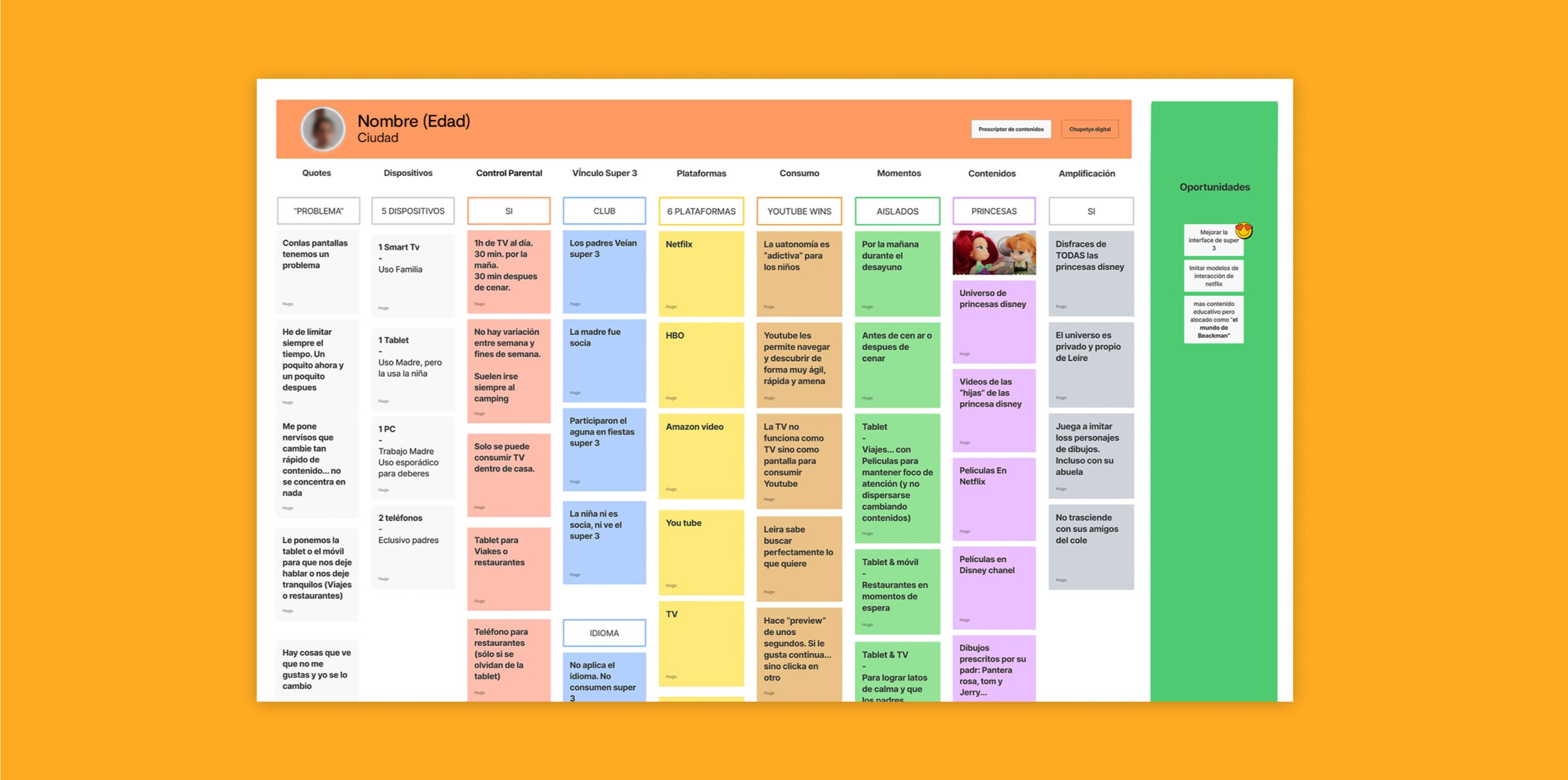 De cada familia se realizó una ficha temática. Y trabajamos sobre un board que nos ayudó a organizar los diferentes post-its con las ideas principales que extrajimos de las entrevistas, de forma que pudimos agrupar y categorizar nuestros insights por temáticas.